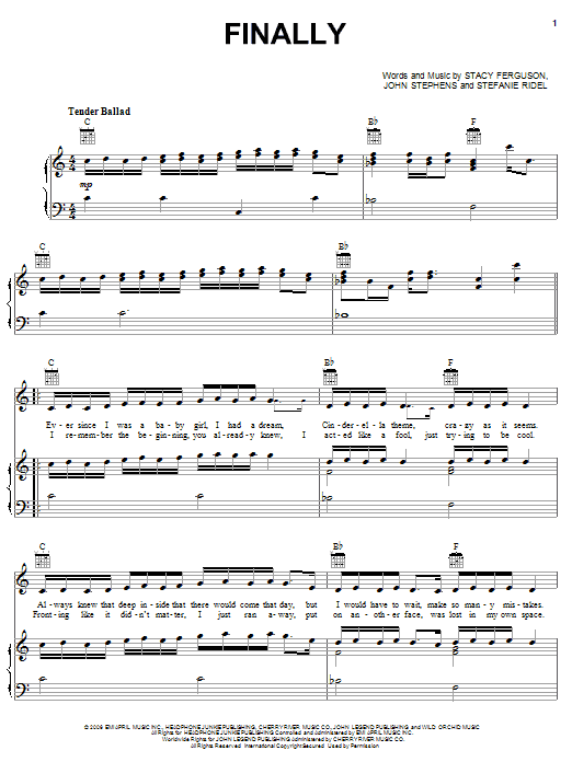 Download or print Fergie Finally sheet music, chords and digital score arranged for Piano, Vocal & Guitar Chords (Right-Hand Melody). This Pop score includes 5 page(s).