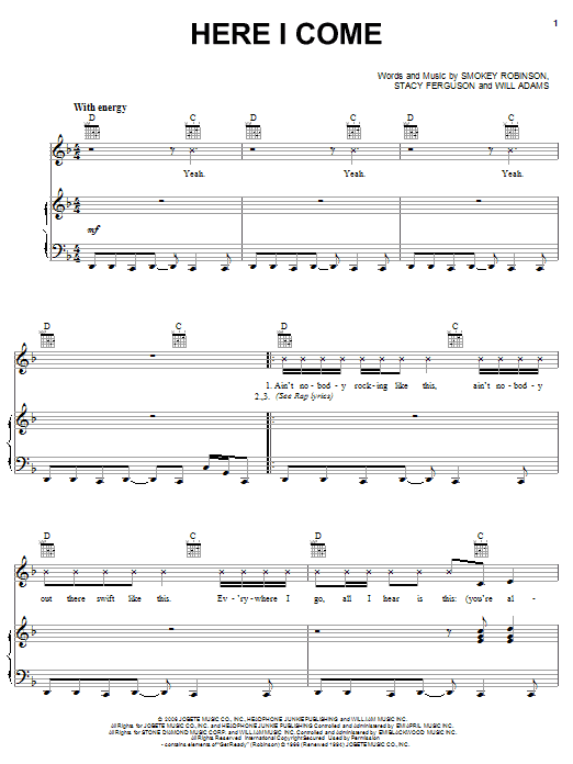 Download or print Fergie Here I Come sheet music, chords and digital score arranged for Piano, Vocal & Guitar Chords (Right-Hand Melody). This Pop score includes 5 page(s).