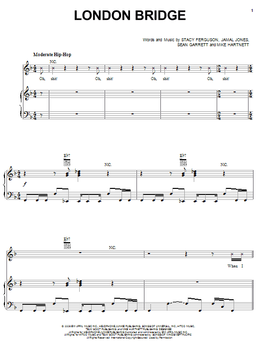 Download or print Fergie London Bridge sheet music, chords and digital score arranged for Piano, Vocal & Guitar Chords (Right-Hand Melody). This Pop score includes 5 page(s).