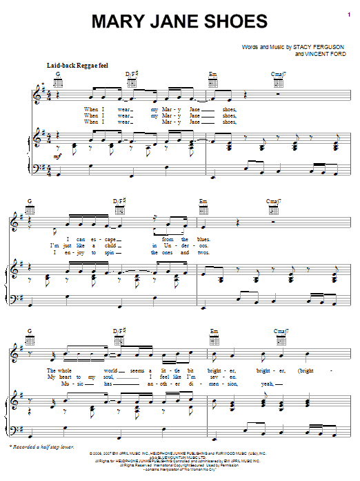 Download or print Fergie Mary Jane Shoes sheet music, chords and digital score arranged for Piano, Vocal & Guitar Chords (Right-Hand Melody). This Pop score includes 5 page(s).