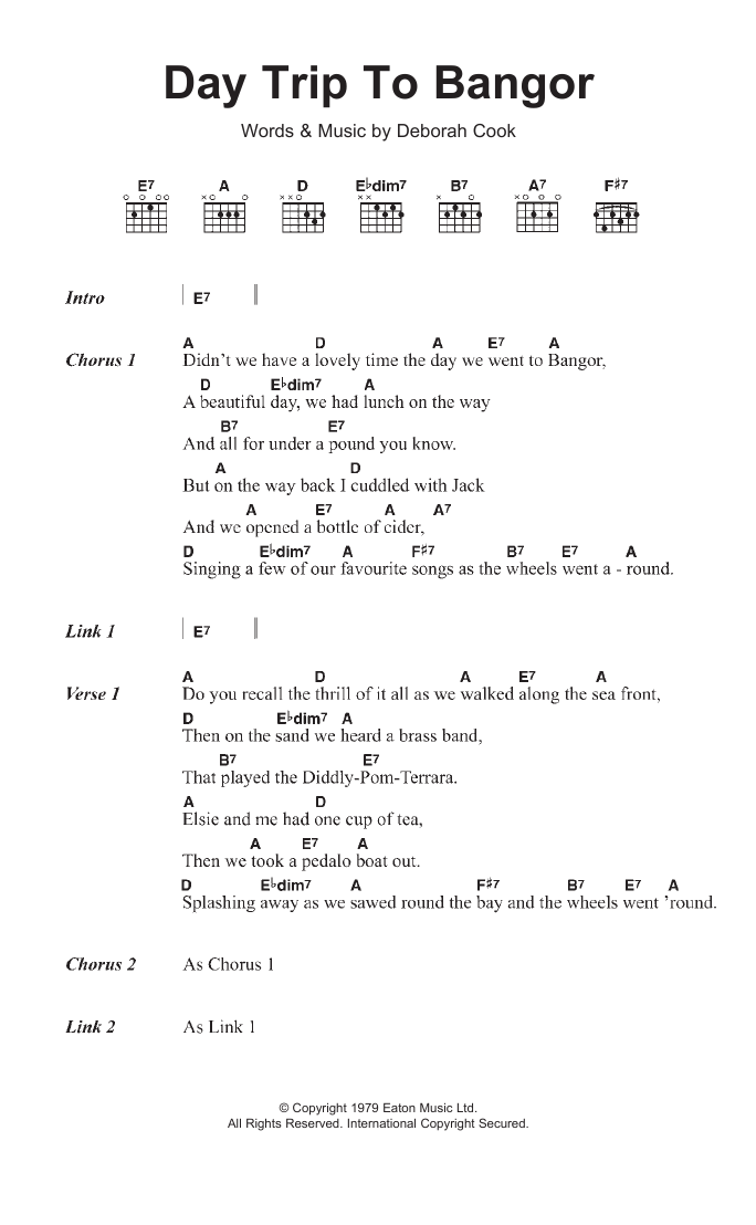 Download or print Fiddler's Dram Day Trip To Bangor sheet music, chords and digital score arranged for Guitar Chords/Lyrics. This Pop score includes 2 page(s).