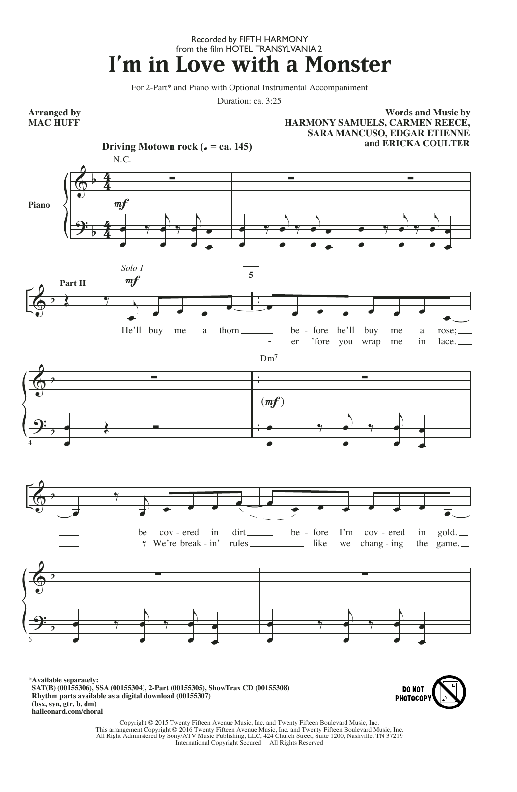 Download or print Mac Huff I'm In Love With A Monster sheet music, chords and digital score arranged for 2-Part Choir. This Pop score includes 11 page(s).