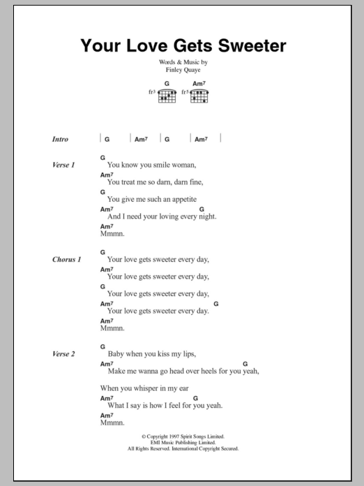 Download or print Finley Quaye Your Love Gets Sweeter sheet music, chords and digital score arranged for Guitar Chords/Lyrics. This Pop score includes 2 page(s).