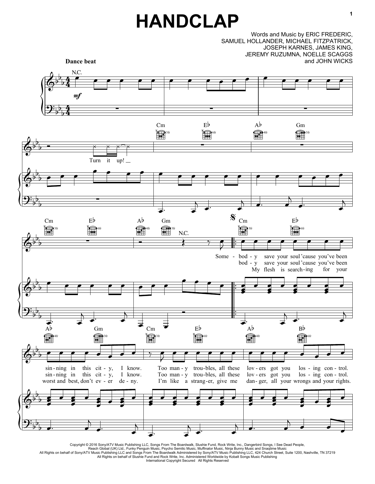 Download or print Fitz And The Tantrums HandClap sheet music, chords and digital score arranged for Piano, Vocal & Guitar Chords (Right-Hand Melody). This Pop score includes 5 page(s).
