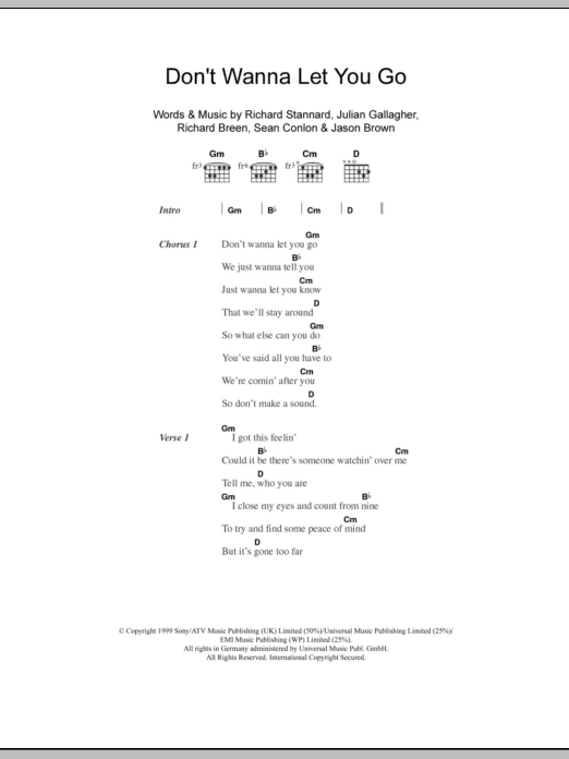 Download or print Five Don't Wanna Let You Go sheet music, chords and digital score arranged for Guitar Chords/Lyrics. This Pop score includes 2 page(s).