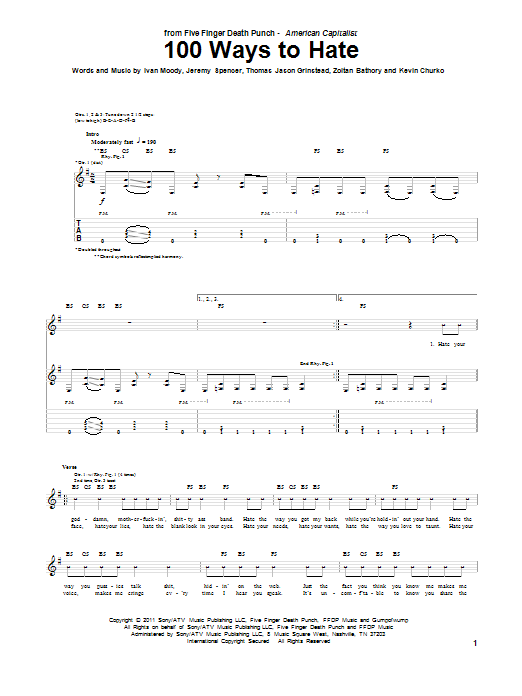 Download or print Five Finger Death Punch 100 Ways To Hate sheet music, chords and digital score arranged for Guitar Tab. This Metal score includes 6 page(s).
