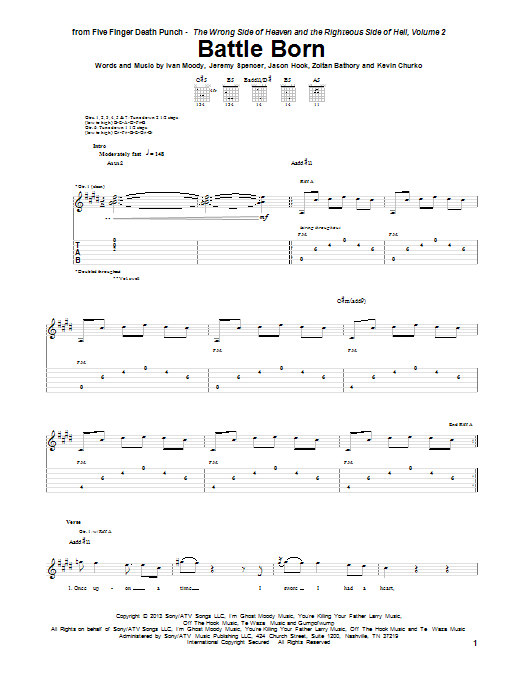 Download or print Five Finger Death Punch Battle Born sheet music, chords and digital score arranged for Guitar Tab. This Pop score includes 14 page(s).