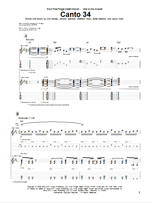 Download or print Five Finger Death Punch Canto 34 sheet music, chords and digital score arranged for Guitar Tab. This Metal score includes 13 page(s).