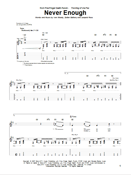 Download or print Five Finger Death Punch Never Enough sheet music, chords and digital score arranged for Guitar Tab. This Metal score includes 9 page(s).