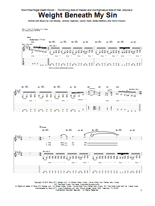 Download or print Five Finger Death Punch Weight Beneath My Sin sheet music, chords and digital score arranged for Guitar Tab. This Pop score includes 10 page(s).