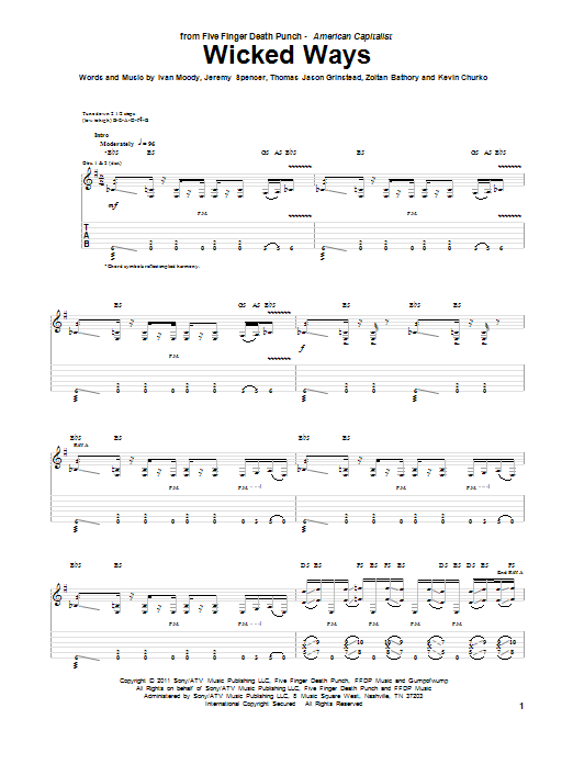 Download or print Five Finger Death Punch Wicked Ways sheet music, chords and digital score arranged for Guitar Tab. This Metal score includes 4 page(s).