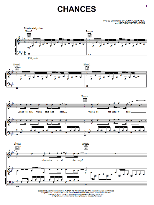 Download or print Five For Fighting Chances sheet music, chords and digital score arranged for Piano, Vocal & Guitar Chords (Right-Hand Melody). This Pop score includes 8 page(s).