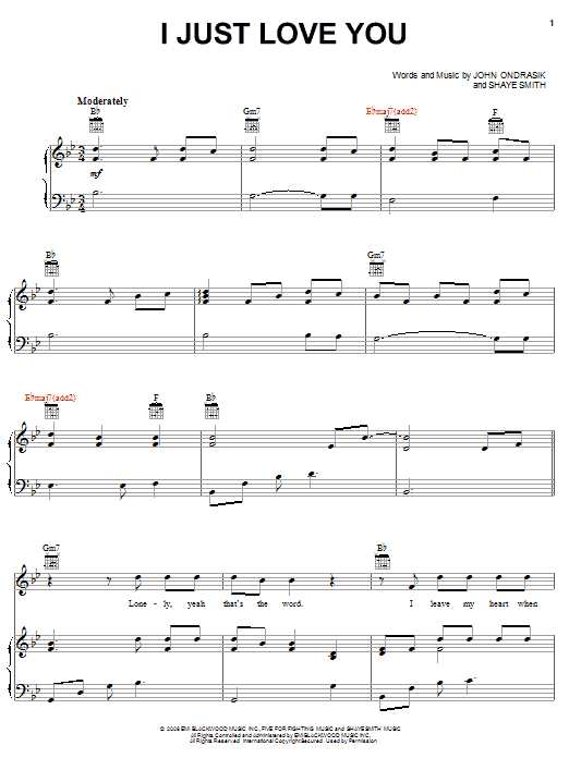 Download or print Five For Fighting I Just Love You sheet music, chords and digital score arranged for Piano, Vocal & Guitar Chords (Right-Hand Melody). This Pop score includes 6 page(s).