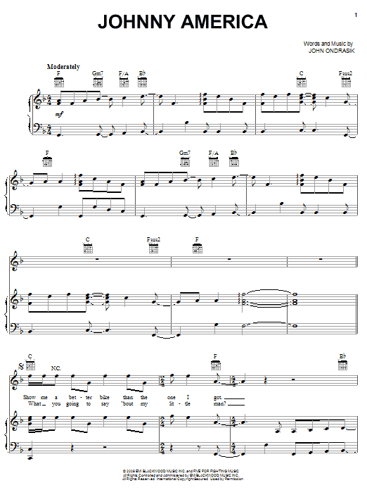 Download or print Five For Fighting Johnny America sheet music, chords and digital score arranged for Piano, Vocal & Guitar Chords (Right-Hand Melody). This Pop score includes 8 page(s).