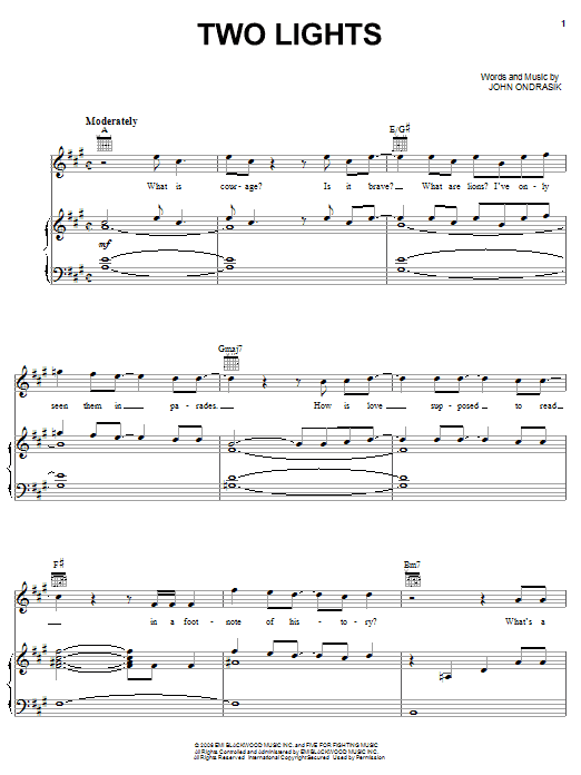 Download or print Five For Fighting Two Lights sheet music, chords and digital score arranged for Piano, Vocal & Guitar Chords (Right-Hand Melody). This Pop score includes 11 page(s).