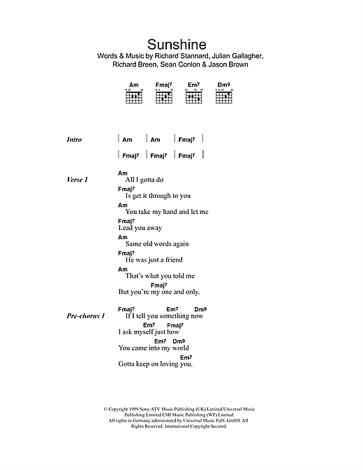 Download or print Five Sunshine sheet music, chords and digital score arranged for Guitar Chords/Lyrics. This Pop score includes 3 page(s).