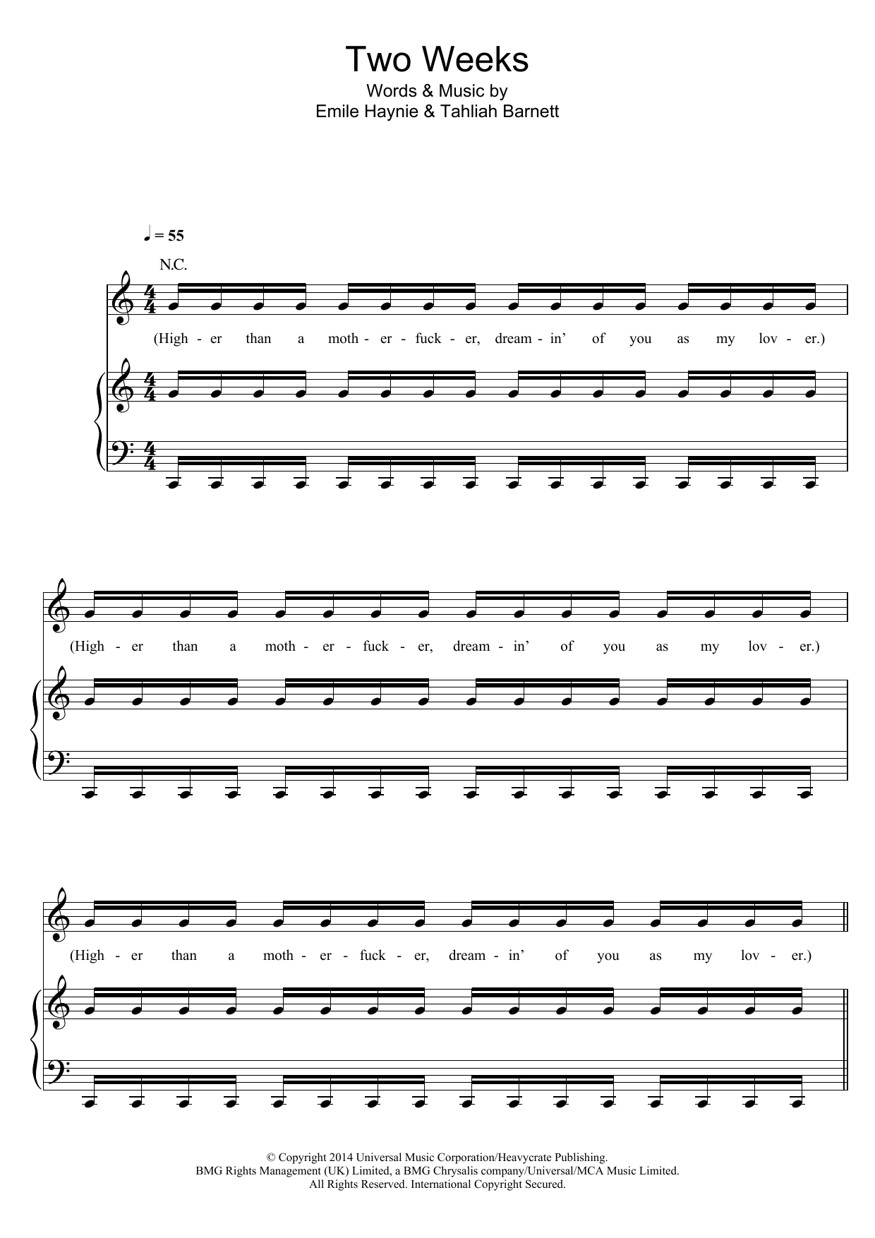 Download or print FKA Twigs Two Weeks sheet music, chords and digital score arranged for Piano, Vocal & Guitar Chords. This Alternative score includes 8 page(s).