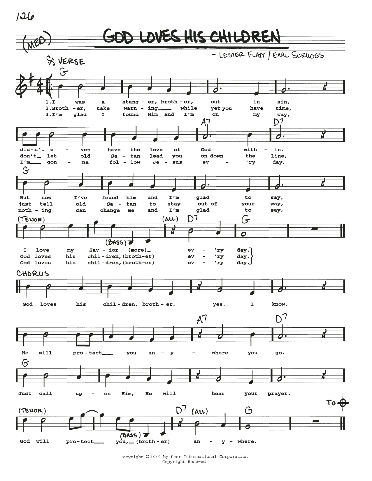 Download or print Flatt & Scruggs God Loves His Children sheet music, chords and digital score arranged for Real Book – Melody, Lyrics & Chords. This Jazz score includes 2 page(s).
