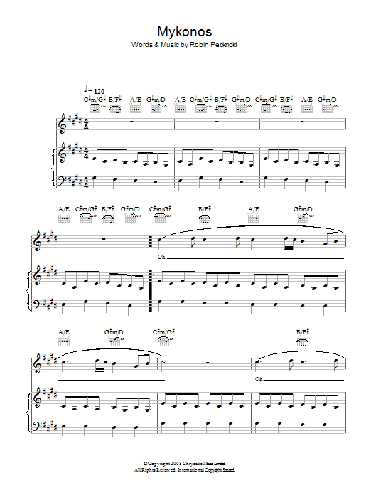 Download or print Fleet Foxes Mykonos sheet music, chords and digital score arranged for Guitar Tab. This Pop score includes 11 page(s).
