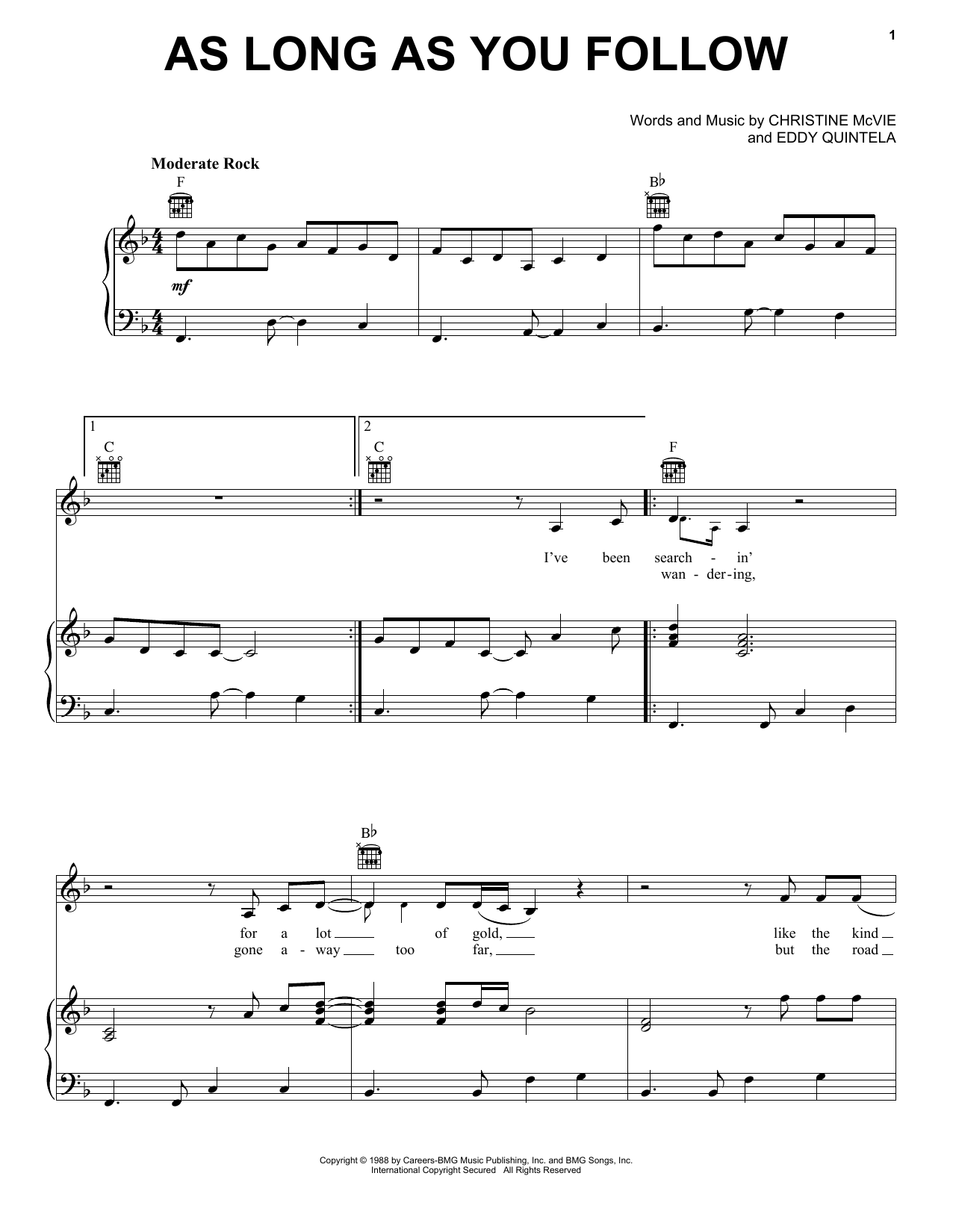 Download or print Fleetwood Mac As Long As You Follow sheet music, chords and digital score arranged for Piano, Vocal & Guitar Chords (Right-Hand Melody). This Pop score includes 5 page(s).
