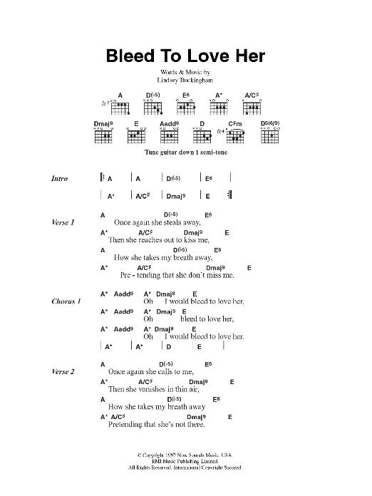 Download or print Fleetwood Mac Bleed To Love Her sheet music, chords and digital score arranged for Guitar Chords/Lyrics. This Rock score includes 2 page(s).