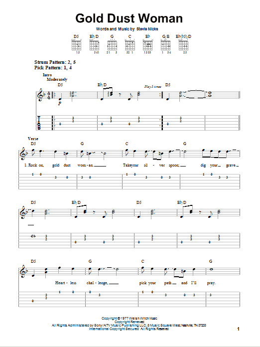 Download or print Fleetwood Mac Gold Dust Woman sheet music, chords and digital score arranged for Piano, Vocal & Guitar Chords (Right-Hand Melody). This Pop score includes 6 page(s).