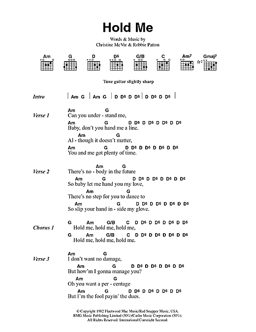 Download or print Fleetwood Mac Hold Me sheet music, chords and digital score arranged for Piano, Vocal & Guitar Chords (Right-Hand Melody). This Pop score includes 3 page(s).
