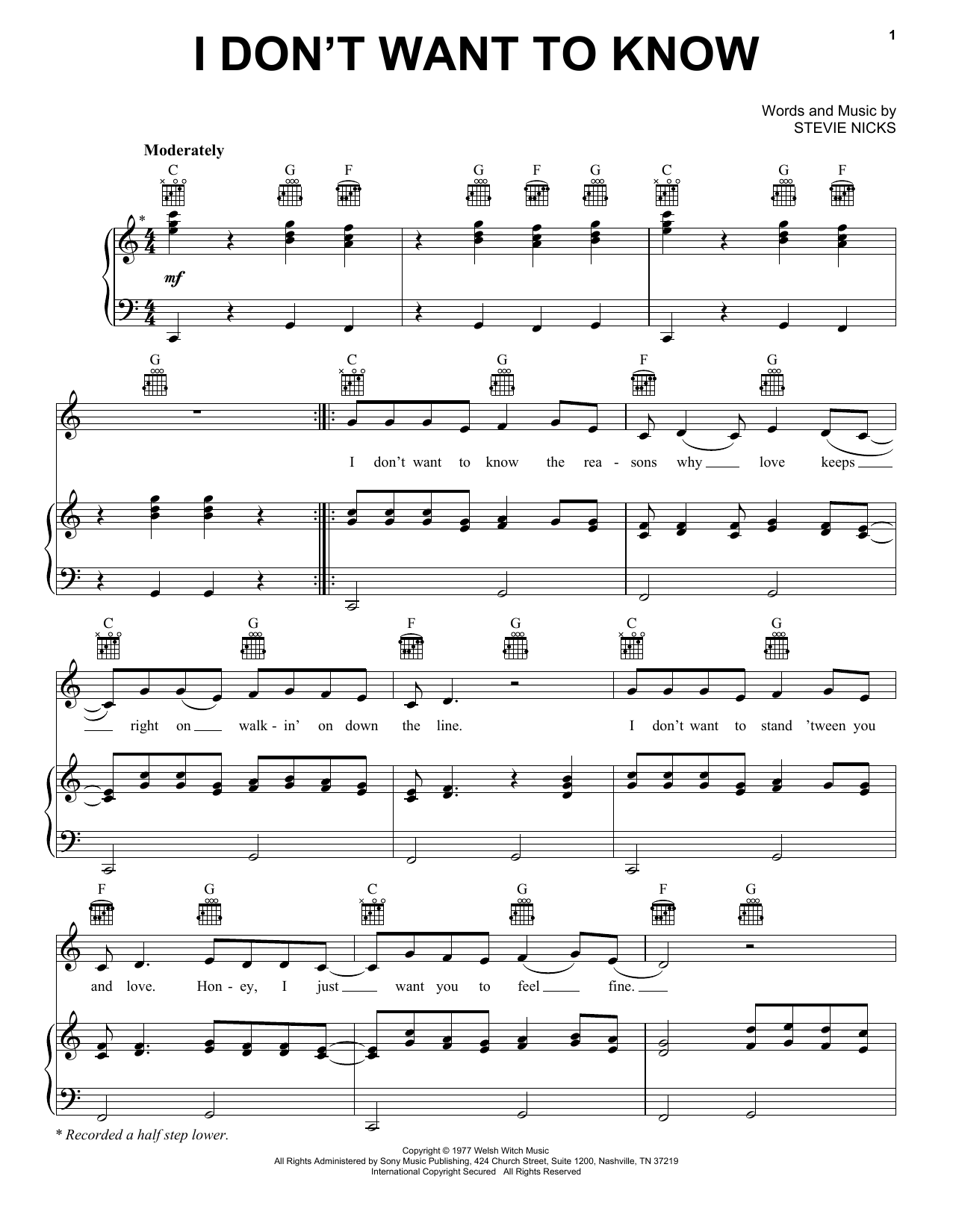 Download or print Fleetwood Mac I Don't Want To Know sheet music, chords and digital score arranged for Guitar Chords/Lyrics. This Rock score includes 2 page(s).