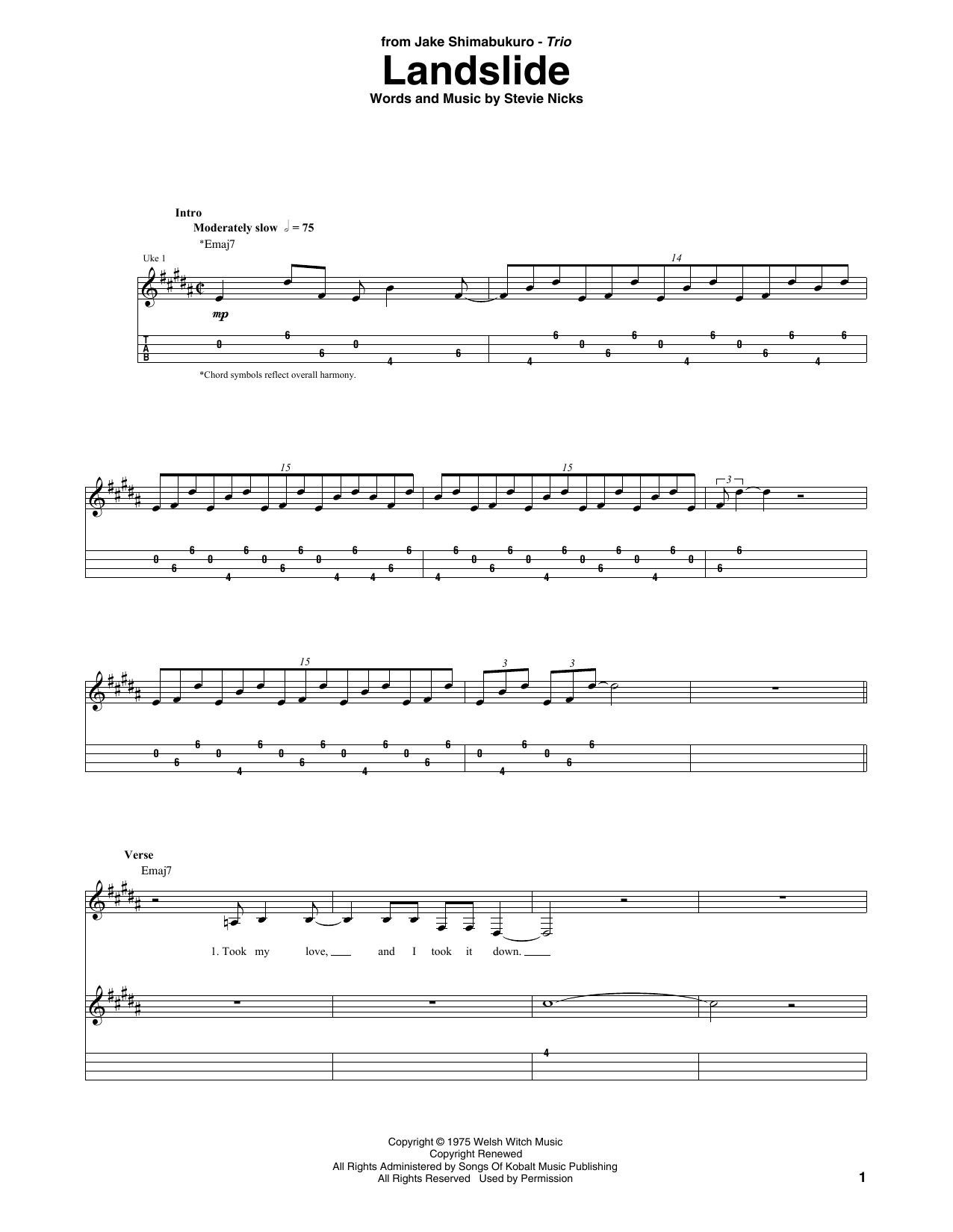 Download or print Fleetwood Mac Landslide (arr. Jake Shimabukuro Trio) sheet music, chords and digital score arranged for Ukulele Tab. This Pop score includes 7 page(s).