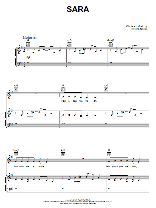 Download or print Fleetwood Mac Sara sheet music, chords and digital score arranged for Guitar Chords/Lyrics. This Rock score includes 3 page(s).
