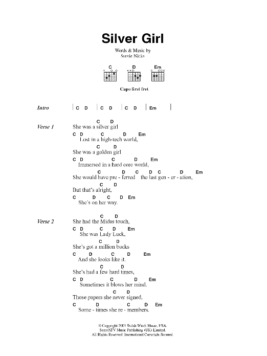 Download or print Fleetwood Mac Silver Girl sheet music, chords and digital score arranged for Guitar Chords/Lyrics. This Rock score includes 3 page(s).