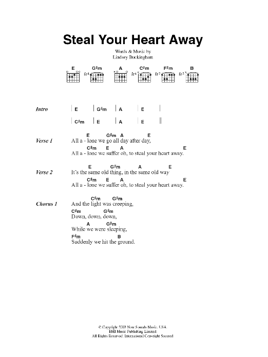 Download or print Fleetwood Mac Steal Your Heart Away sheet music, chords and digital score arranged for Guitar Chords/Lyrics. This Rock score includes 2 page(s).
