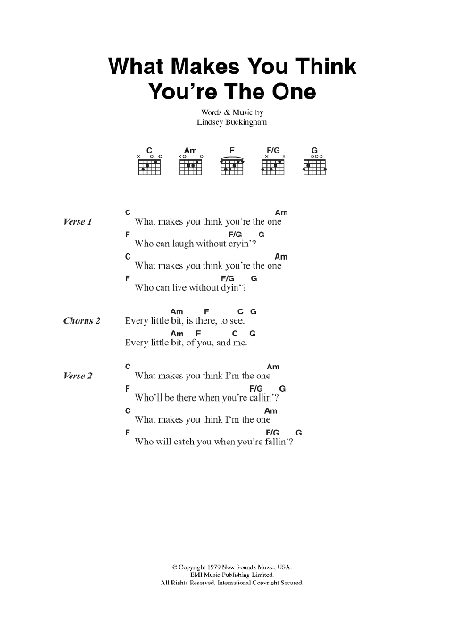 Download or print Fleetwood Mac What Makes You Think You're The One sheet music, chords and digital score arranged for Guitar Chords/Lyrics. This Rock score includes 2 page(s).