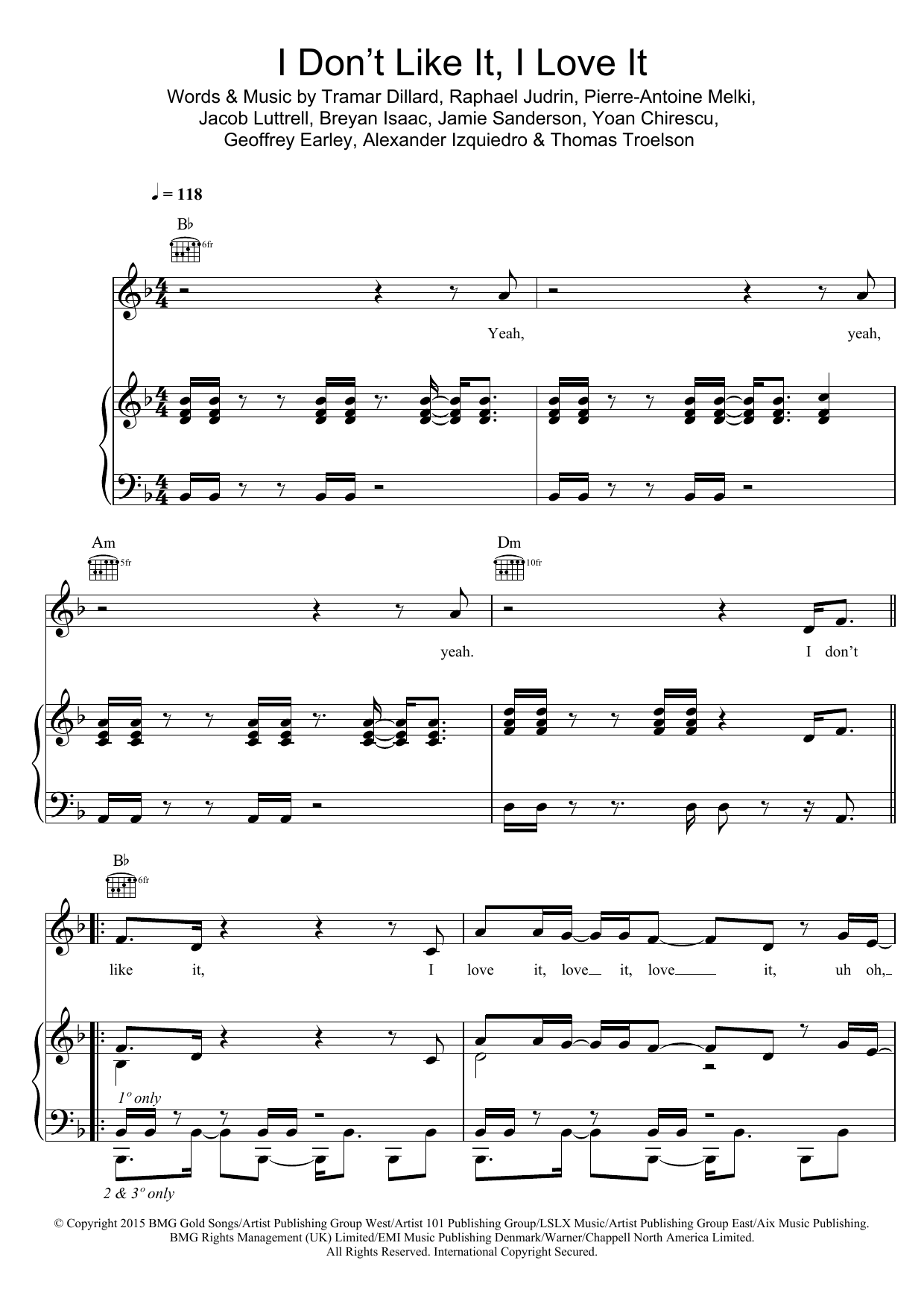 Download or print Flo Rida I Don't Like It, I Love It sheet music, chords and digital score arranged for Piano, Vocal & Guitar Chords. This Hip-Hop score includes 7 page(s).