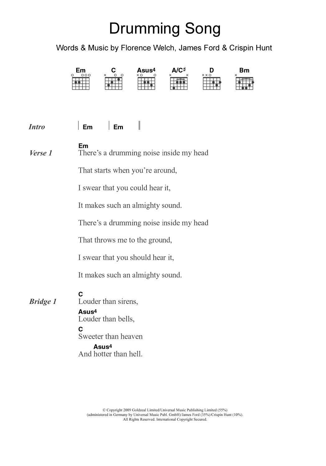 Download or print Florence And The Machine Drumming Song sheet music, chords and digital score arranged for Guitar Chords/Lyrics. This Pop score includes 3 page(s).