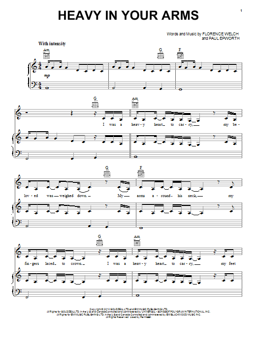Download or print Florence And The Machine Heavy In Your Arms sheet music, chords and digital score arranged for Piano, Vocal & Guitar Chords (Right-Hand Melody). This Pop score includes 8 page(s).