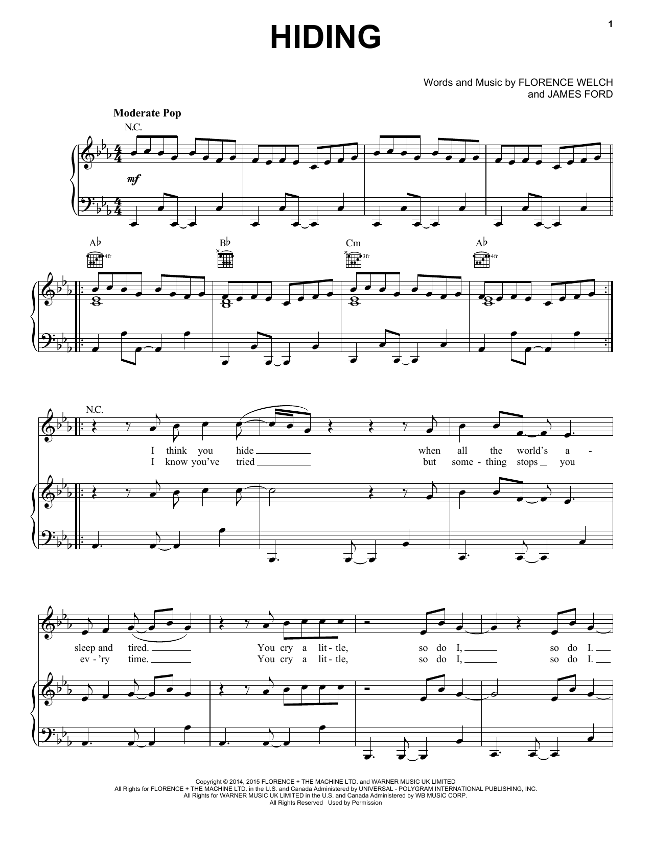 Download or print Florence And The Machine Hiding sheet music, chords and digital score arranged for Piano, Vocal & Guitar Chords (Right-Hand Melody). This Alternative score includes 6 page(s).