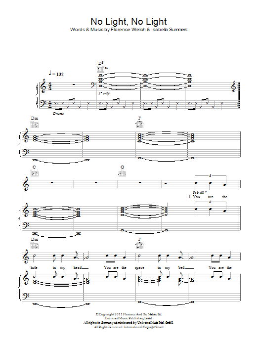Download or print Florence And The Machine No Light, No Light sheet music, chords and digital score arranged for Piano, Vocal & Guitar Chords. This Alternative score includes 8 page(s).