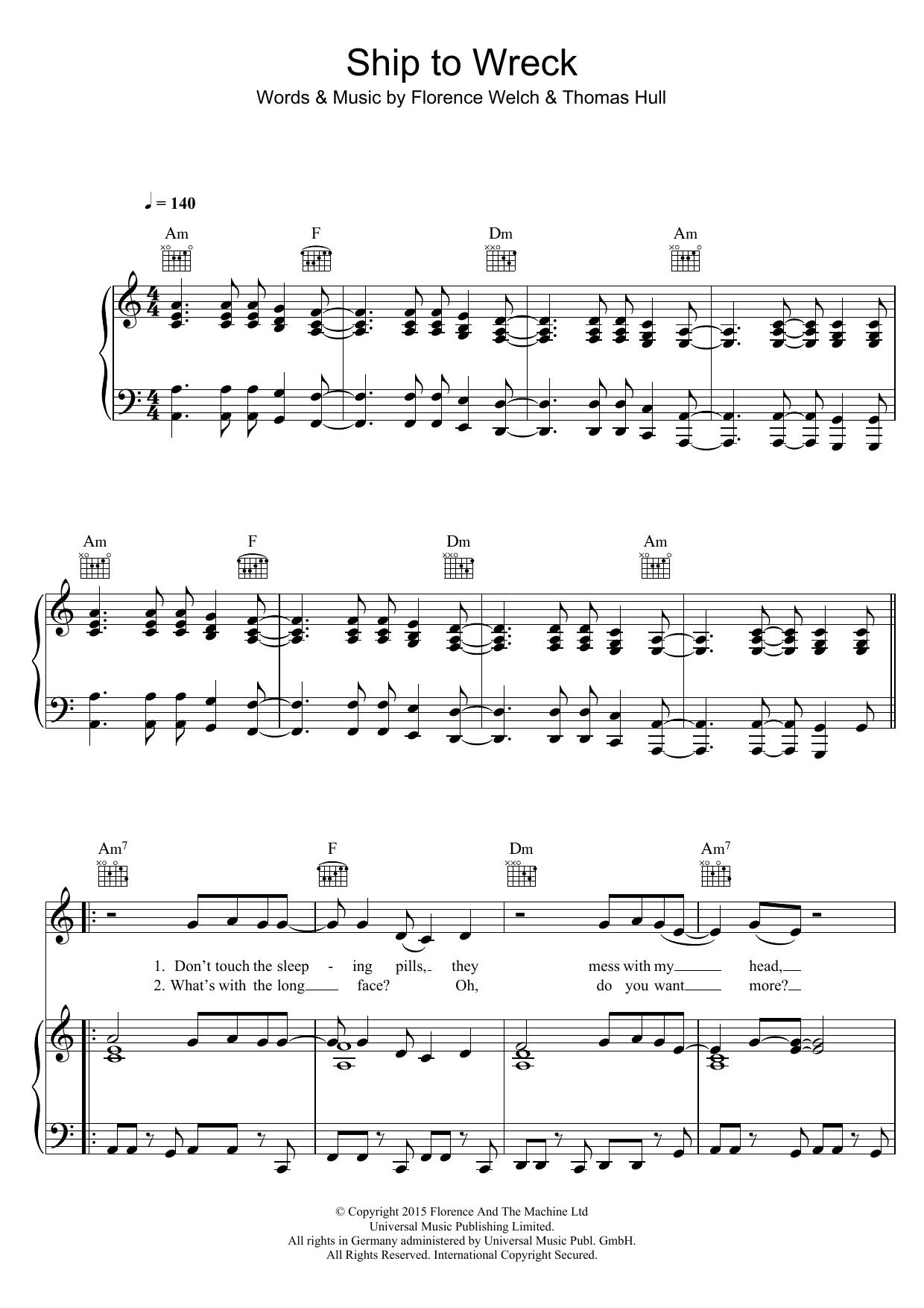Download or print Florence And The Machine Ship To Wreck sheet music, chords and digital score arranged for Guitar Chords/Lyrics. This Pop score includes 2 page(s).