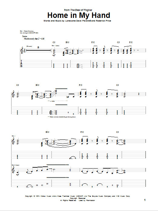 Download or print Foghat Home In My Hand sheet music, chords and digital score arranged for Guitar Tab. This Metal score includes 12 page(s).