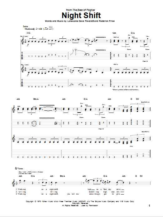 Download or print Foghat Night Shift sheet music, chords and digital score arranged for Guitar Tab. This Metal score includes 18 page(s).