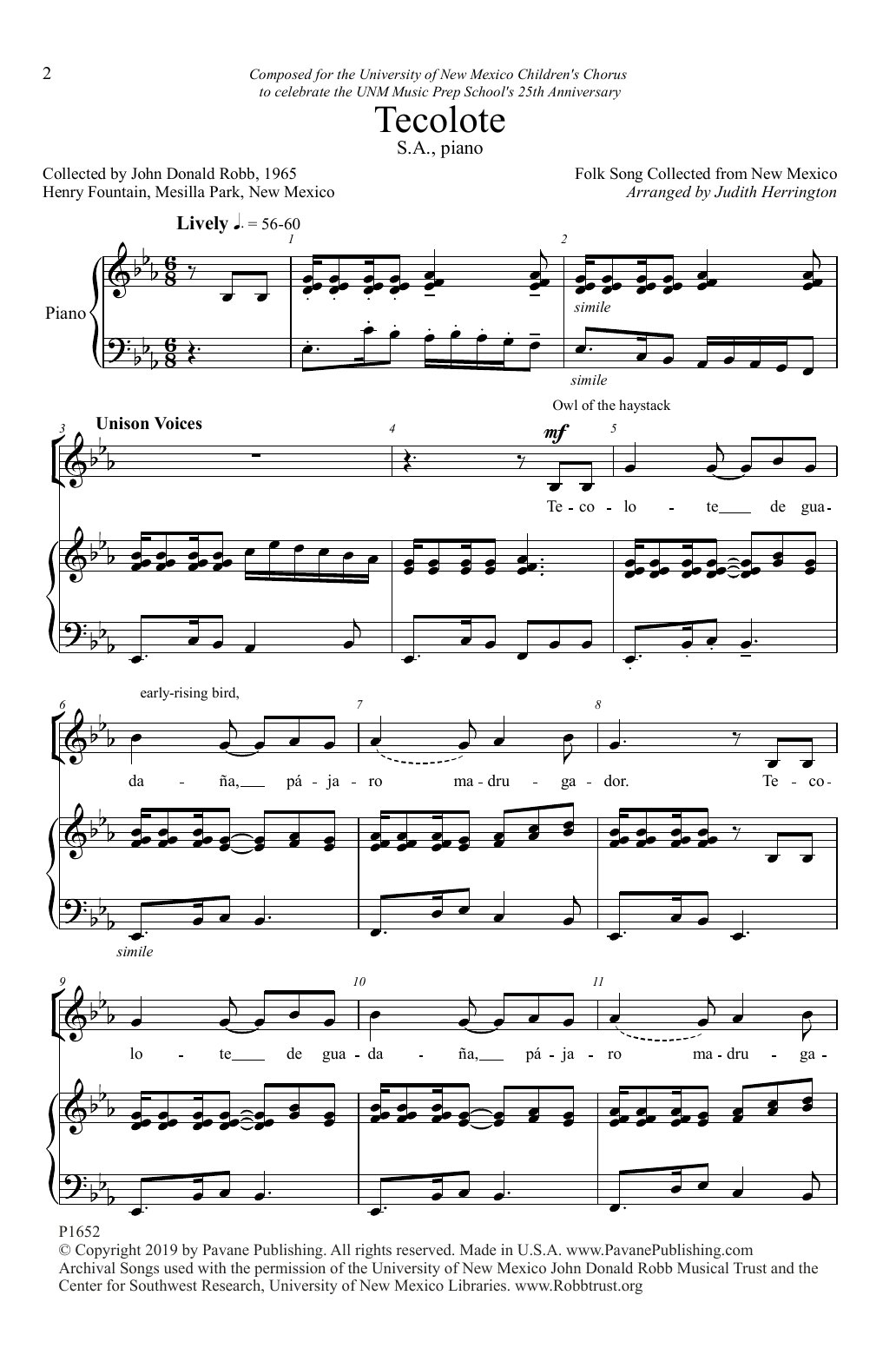 Download or print Folk Song Tecolote (arr. Judith Herrington) sheet music, chords and digital score arranged for Choir. This Concert score includes 7 page(s).
