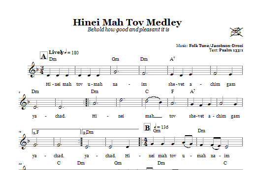 Download or print Folk Tune Hinei Mah Tov Medley (Behold How Good And Pleasant It Is) sheet music, chords and digital score arranged for Lead Sheet / Fake Book. This Traditional score includes 1 page(s).