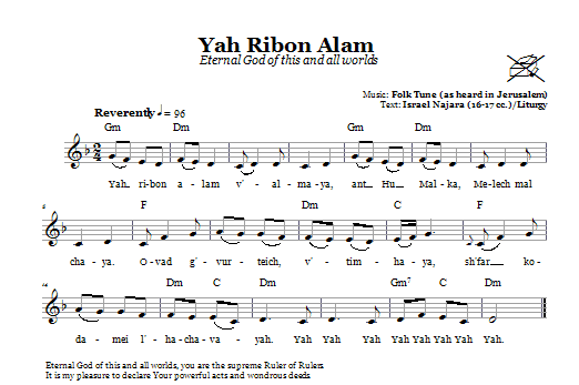 Download or print Folk Tune Yah Ribon Olam (Eternal God Of This And All Worlds) sheet music, chords and digital score arranged for Lead Sheet / Fake Book. This Traditional score includes 1 page(s).
