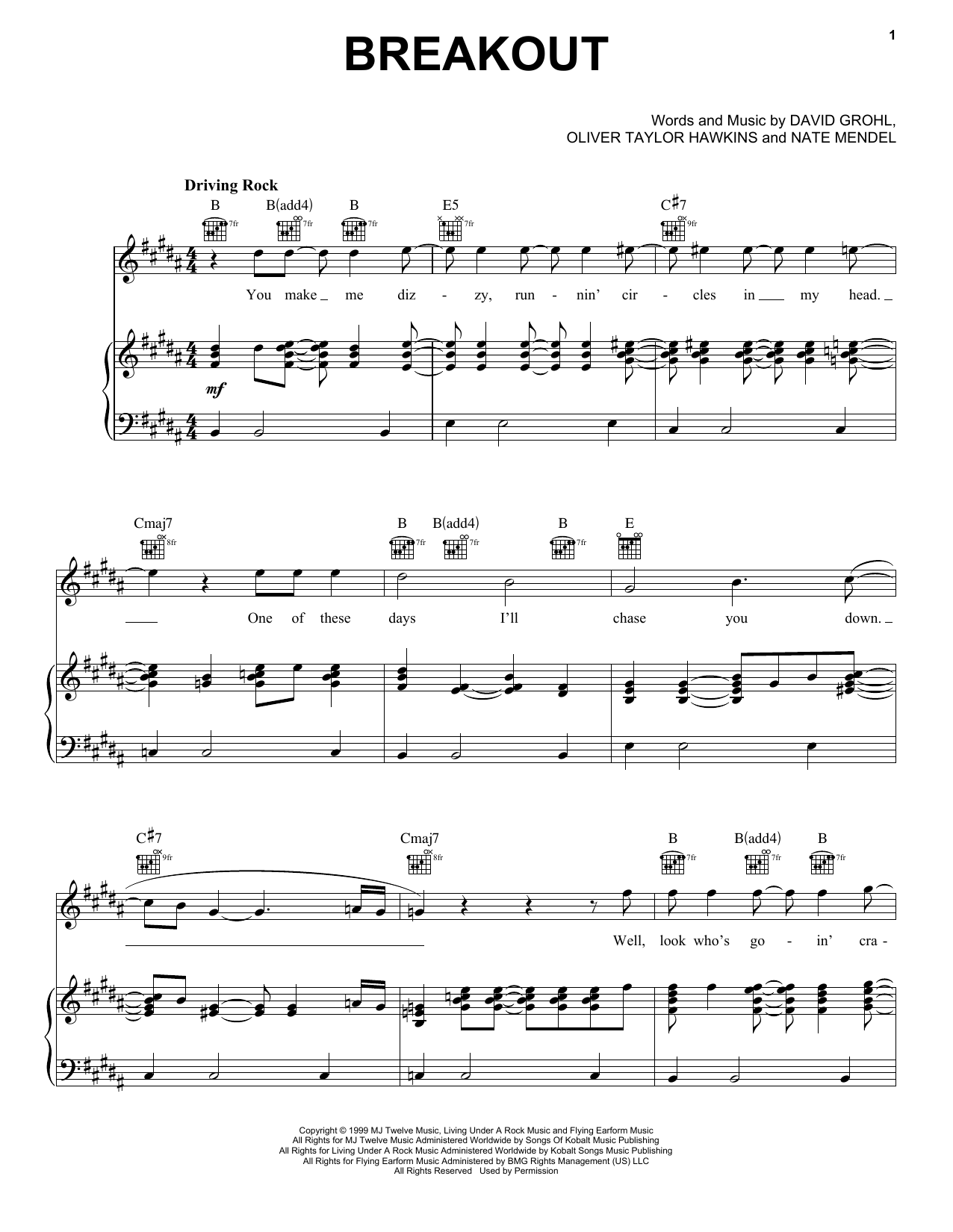 Download or print Foo Fighters Breakout sheet music, chords and digital score arranged for Piano, Vocal & Guitar Chords (Right-Hand Melody). This Rock score includes 9 page(s).