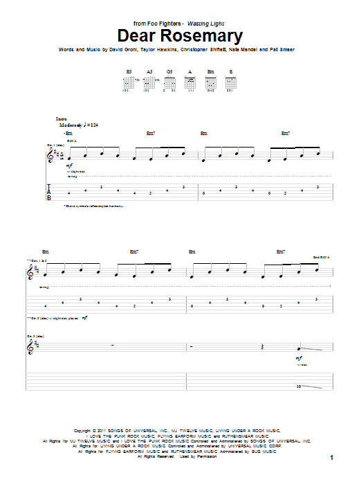 Download or print Foo Fighters Dear Rosemary sheet music, chords and digital score arranged for Guitar Tab. This Pop score includes 11 page(s).