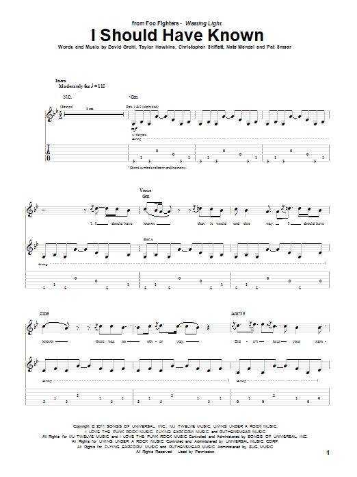 Download or print Foo Fighters I Should Have Known sheet music, chords and digital score arranged for Guitar Tab. This Pop score includes 11 page(s).