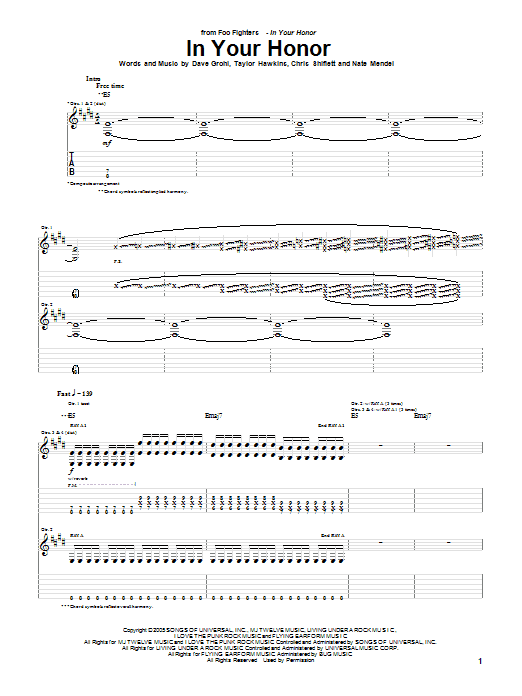 Download or print Foo Fighters In Your Honor sheet music, chords and digital score arranged for Guitar Tab. This Alternative score includes 8 page(s).
