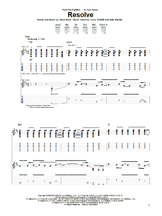 Download or print Foo Fighters Resolve sheet music, chords and digital score arranged for Guitar Tab. This Alternative score includes 9 page(s).