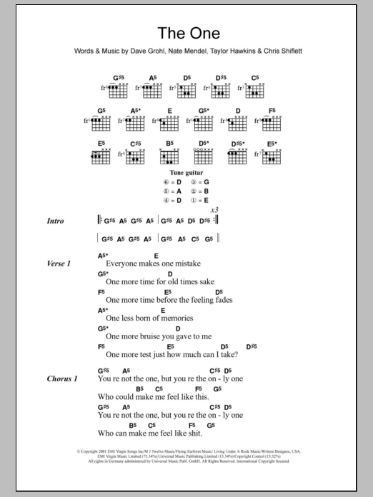 Download or print Foo Fighters The One sheet music, chords and digital score arranged for Guitar Chords/Lyrics. This Rock score includes 3 page(s).